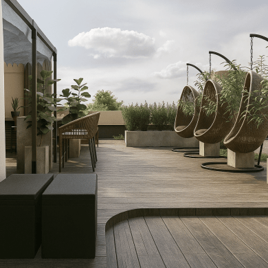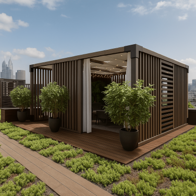 Крыша преобразована в функциональную зону отдыха над городом, где можно проводить встречи, работать или просто проводить время на открытом воздухе.