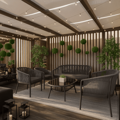 Пространство организовано по принципу гибкой модульной структуры. Перголы, зелёные насаждения и уличная мебель формируют несколько взаимосвязанных зон: места для отдыха, неформального общения и небольших встреч.