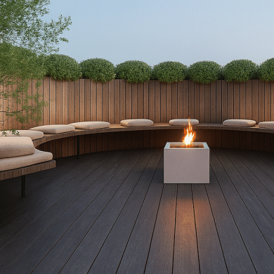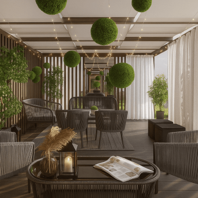 Сочетание современных материалов и озеленения создаёт баланс между технологичной архитектурой здания и природной средой.
