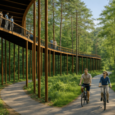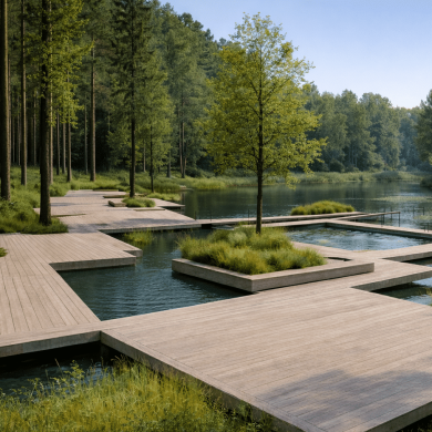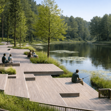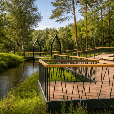 Каждый маршрут, материал и видовая точка продуманы так, чтобы человек чувствовал ритм леса, шум воды и мягкий свет, проходящий через кроны деревьев.
