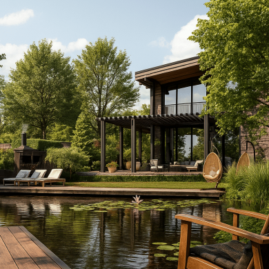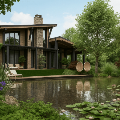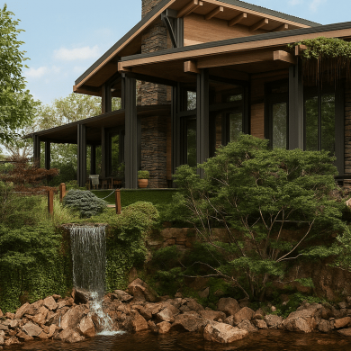 По территории участка проходит горная река Старики, усиливающая атмосферу природного ландшафта, а в нижней части участка расположен декоративный пруд, который становится тихим центром композиции и отражает окружающую зелень.