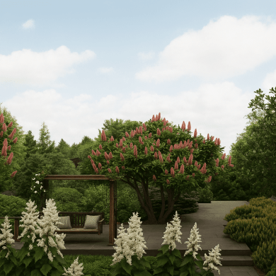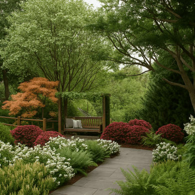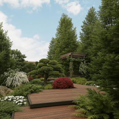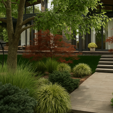 Такая палитра растений создаёт многослойную структуру сада и сохраняет декоративность пространства в течение всего сезона.
