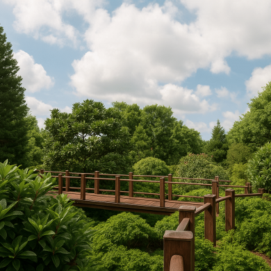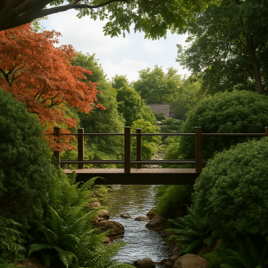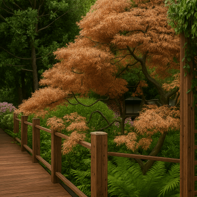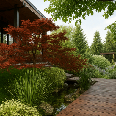 Озеленение построено на сочетании хвойных деревьев, японских клёнов, злаков и цветущих кустарников.