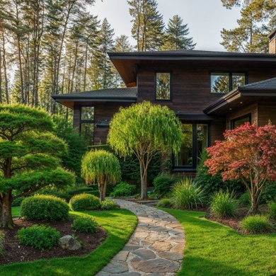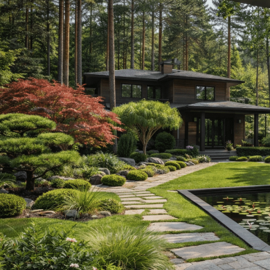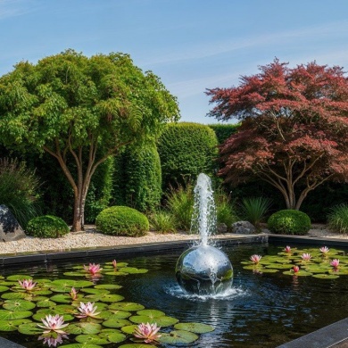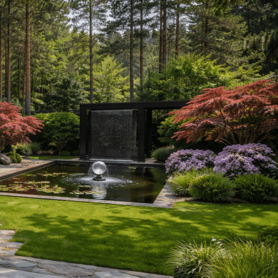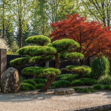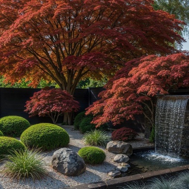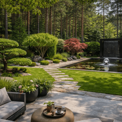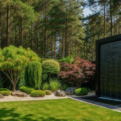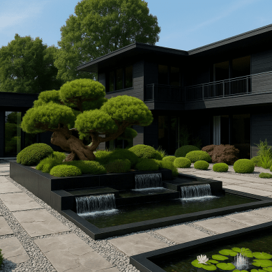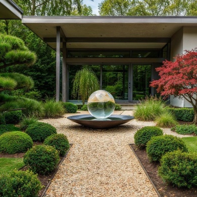 Сад камней и гравийные поверхности создают спокойный фон для озеленения. Зелёные островки с топиарными формами и декоративными кустарниками формируют чёткую структуру пространства и подчеркивают лаконичность композиции.Контраст камня, воды и зелени формирует ритм сада и создаёт атмосферу тишины и уединения.