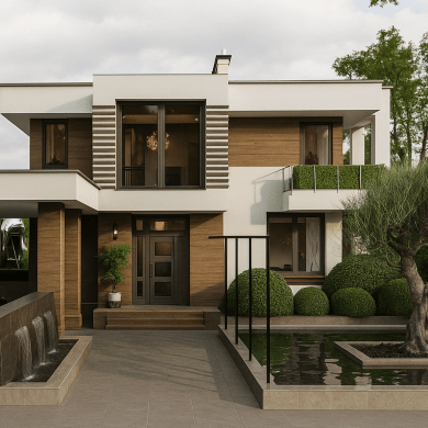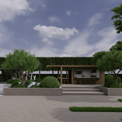 Основная идея проекта — объединить архитектуру дома и сад в единую композицию, где строгая геометрия линий сочетается с мягкостью озеленения и спокойствием водной поверхности.