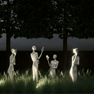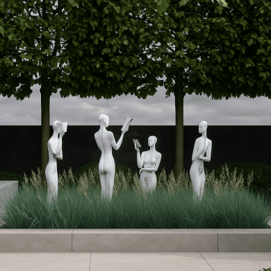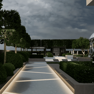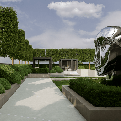 Скульптуры, водные элементы и прогулочные дорожки с подсветкой становятся не только декоративными акцентами, но и формируют движение и глубину пространства.